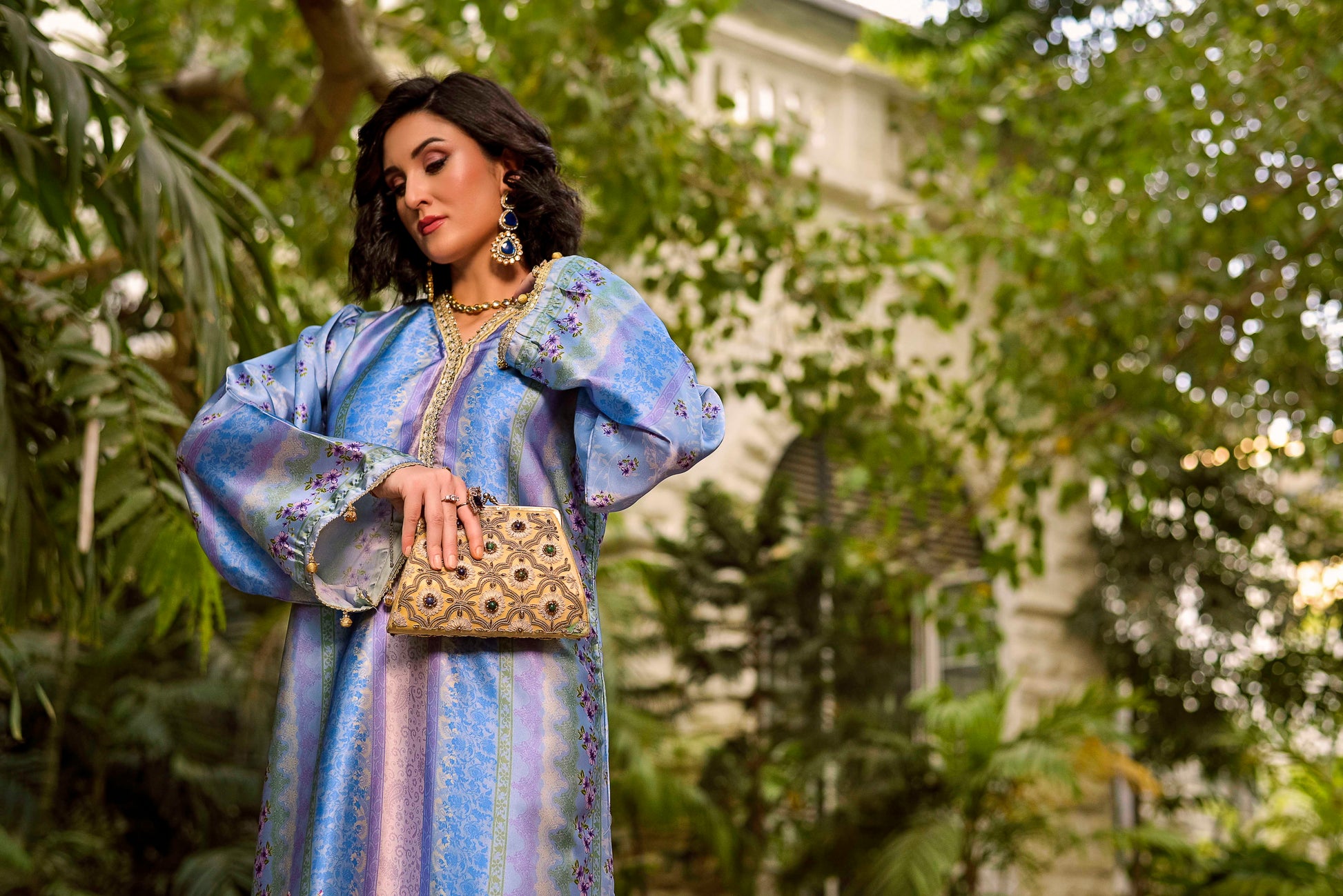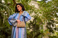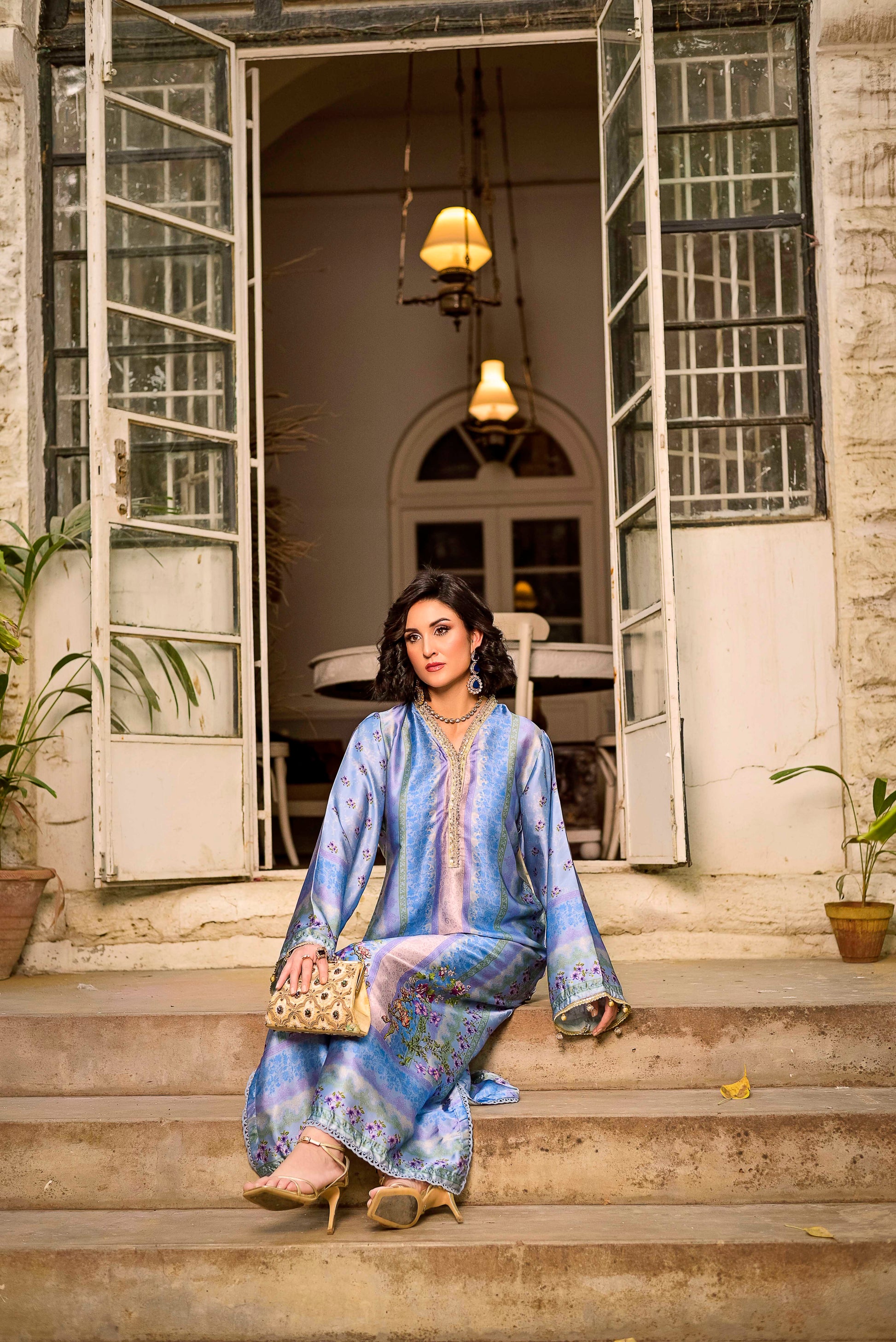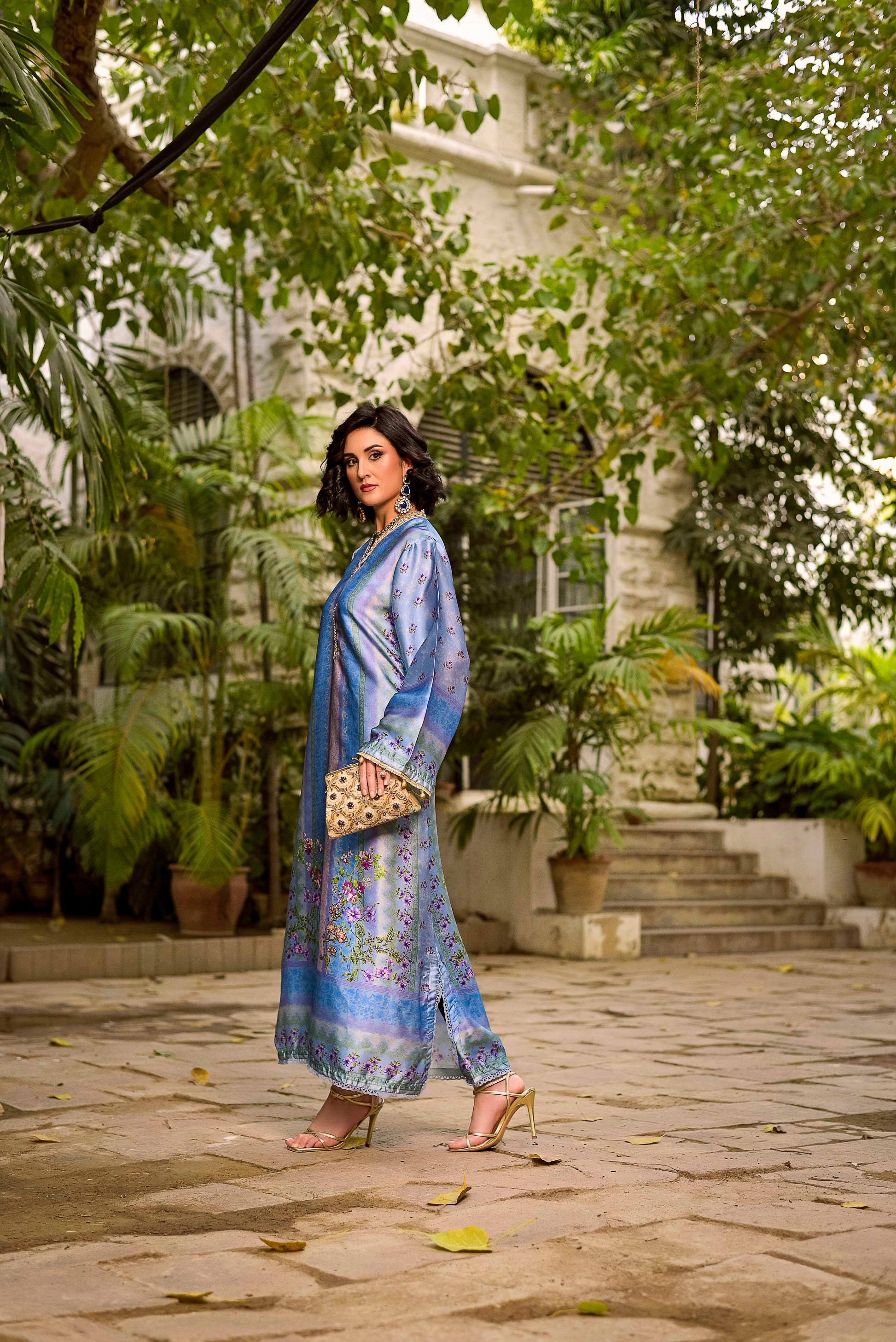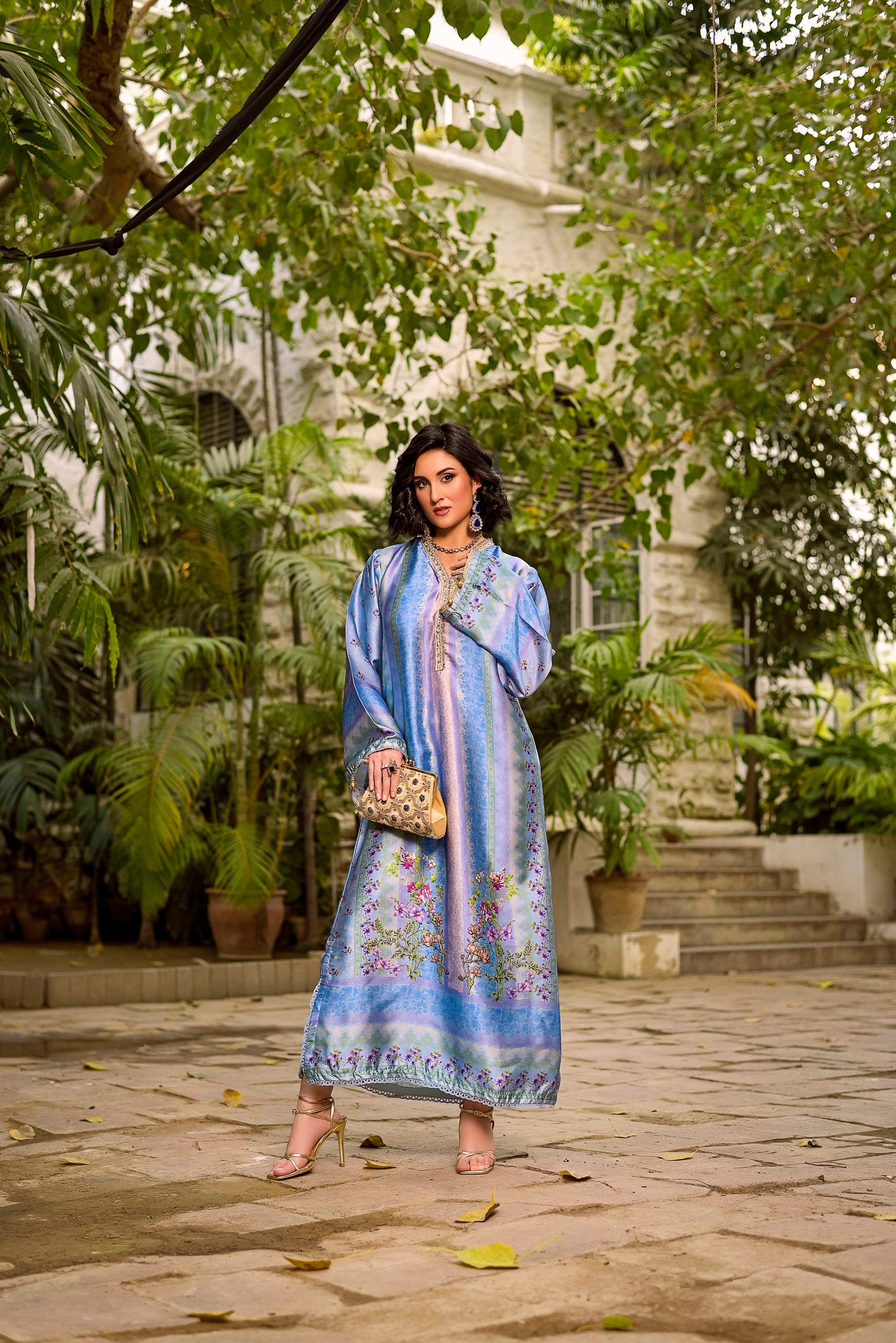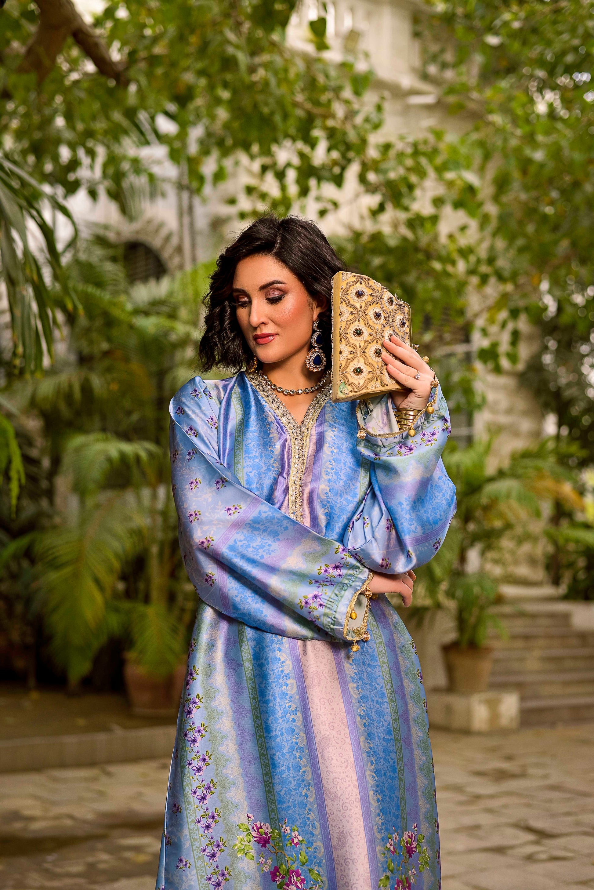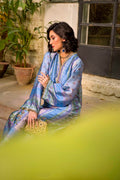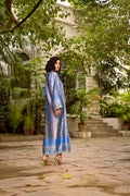 This silk ankle-length outfit is a sophisticated blend of traditional craftsmanship and modern silhouette. It features a luxurious sheen and a rich color palette that transitions through various shades of blue and lilac.